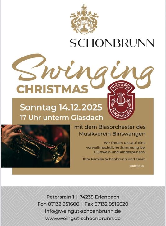 Wir freuen uns, euch bei unserem alljährlichen Swinging Christmas Event im Weingut Schönbrunn am 14.12.2025 um 17 Uhr begrüßen zu dürfen. Lauscht den Weihnachtsliedern bei einem guten Tässchen Glühwein oder Punsch!